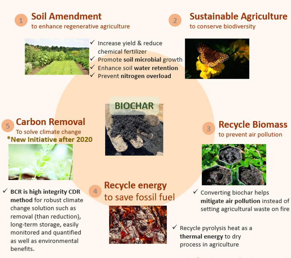 Regenerative Agriculture: Biochar improves soil health, increases yields, and reduces chemical fertilizer use. It promotes microbial growth and enhances water retention.